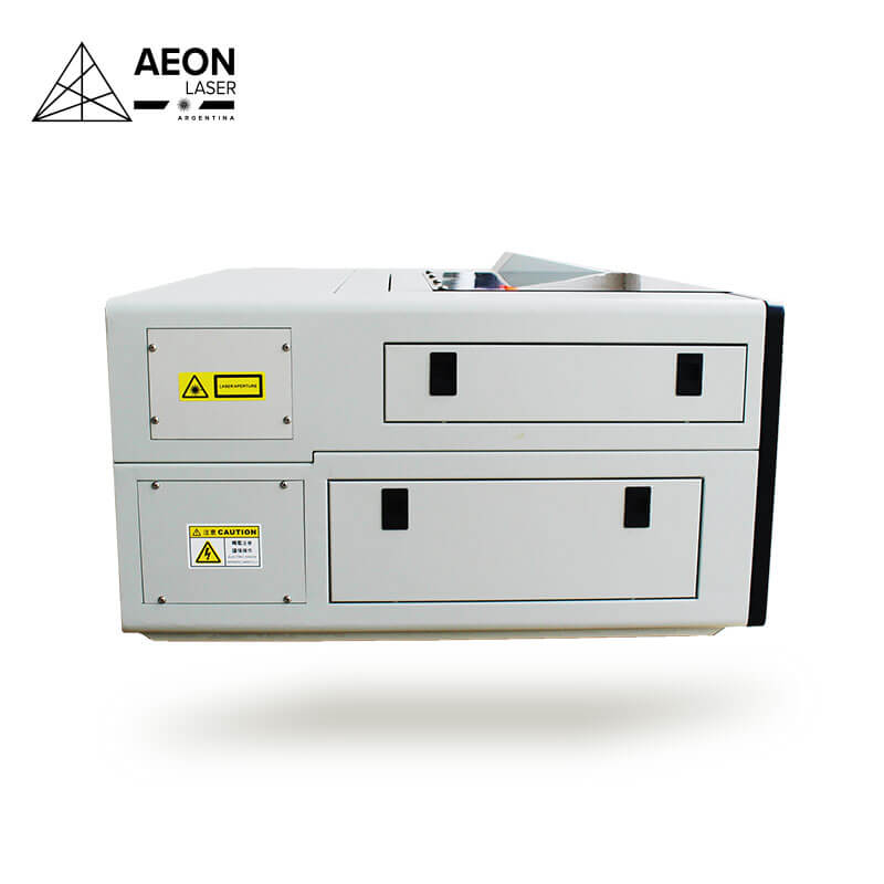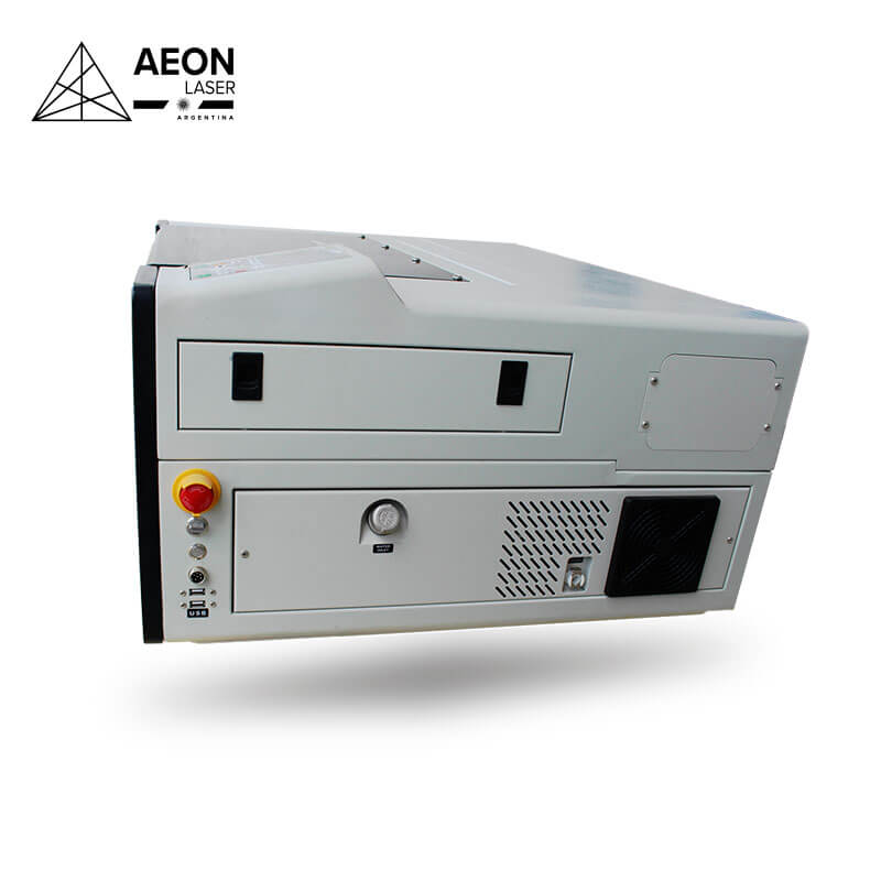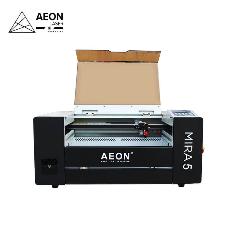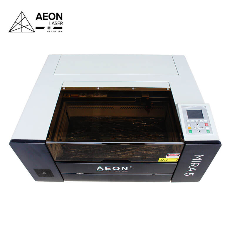 La MIRA 5 es una máquina de grabado y corte láser de escritorio o de hobby. El área de trabajo es de 500 x 300 mm, con refrigeración por agua, extractor y bomba de aire integrados dentro del equipo resultando compacto, moderno y simple de trasladar de un lugar a otro. Este tipo de equipos no pueden ser utilizados de forma continua por más de 4 o 5 horas ya que sino la temperatura del agua sera muy elevada.