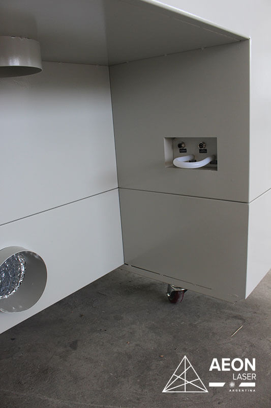 El sistema de asistencia de aire tiene manómetro y regulador brindando a los usuarios la opción de agregar un compresor más potente para procsar materiales más gruesos. La máquina cumple con los estándares de un láser clase 1, contando con una tapa de vidrio templado a prueba fuego, diseñada de forma tal que esté todo cerrado inclusive con una cerradura con llave en cada puerta y ventana para usos no autorizados.
